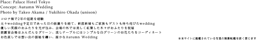 コロナ禍で2年の延期を経験し、元々wedding予定日であった日の前撮りを経て、新郎新婦もご家族もゲストも待ち侘びたwedding優しい笑顔のおふたりを光が包み、会場の外では美しく紅葉した木々がおふたりを祝福披露宴会場はふんだんなグリーン、流しテーブルにはシンプルな白グリーンのお花たちをコーディネートお色直しでは想い出の振袖を纏い、温かなAutumn Wedding